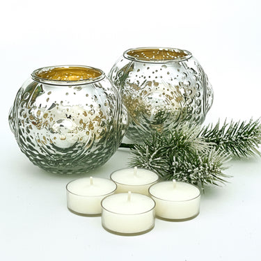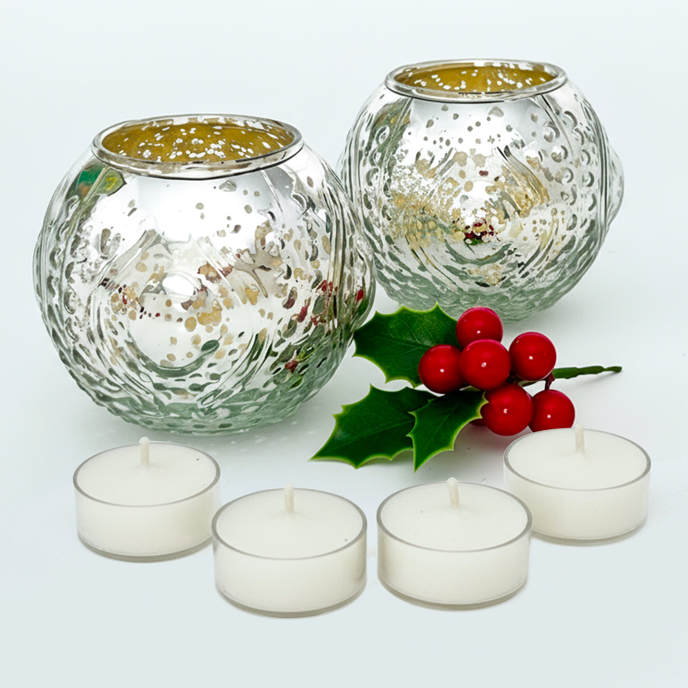 - Set includes 2 Mercury Glass Tea Light & Votive Holders and 4 Tea Light candles.